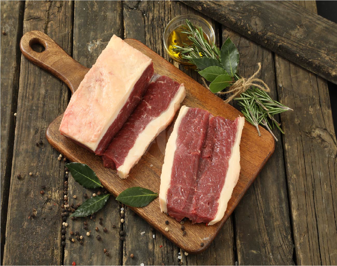 Bolsa que contiene 4 porciones de corte sencillo maduradas en de corte grueso con un peso aprox de 250 gr por porción
